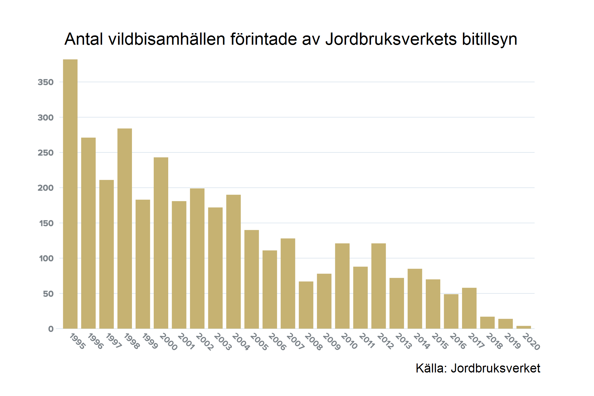 Utan stöd från naturvårdare är honungsbiet helt oskyddat. I avsikt att kontrollera amerikansk yngelröta, har tusentals vilda honungsbi-superorganismer avdödats av Jordbruksverkets bitillsyn (se diagram). Svensk forskning tyder dock på att problemet med amerikansk yngelröta först och främst beror på biskötselmetoderna och att sjukdomen inte är dödlig i frånvaron av sådana metoder.11 Av de vilda superorgansimer som har inspekterats före eller efter de avdödats, befanns bara 13% vara infekterade.